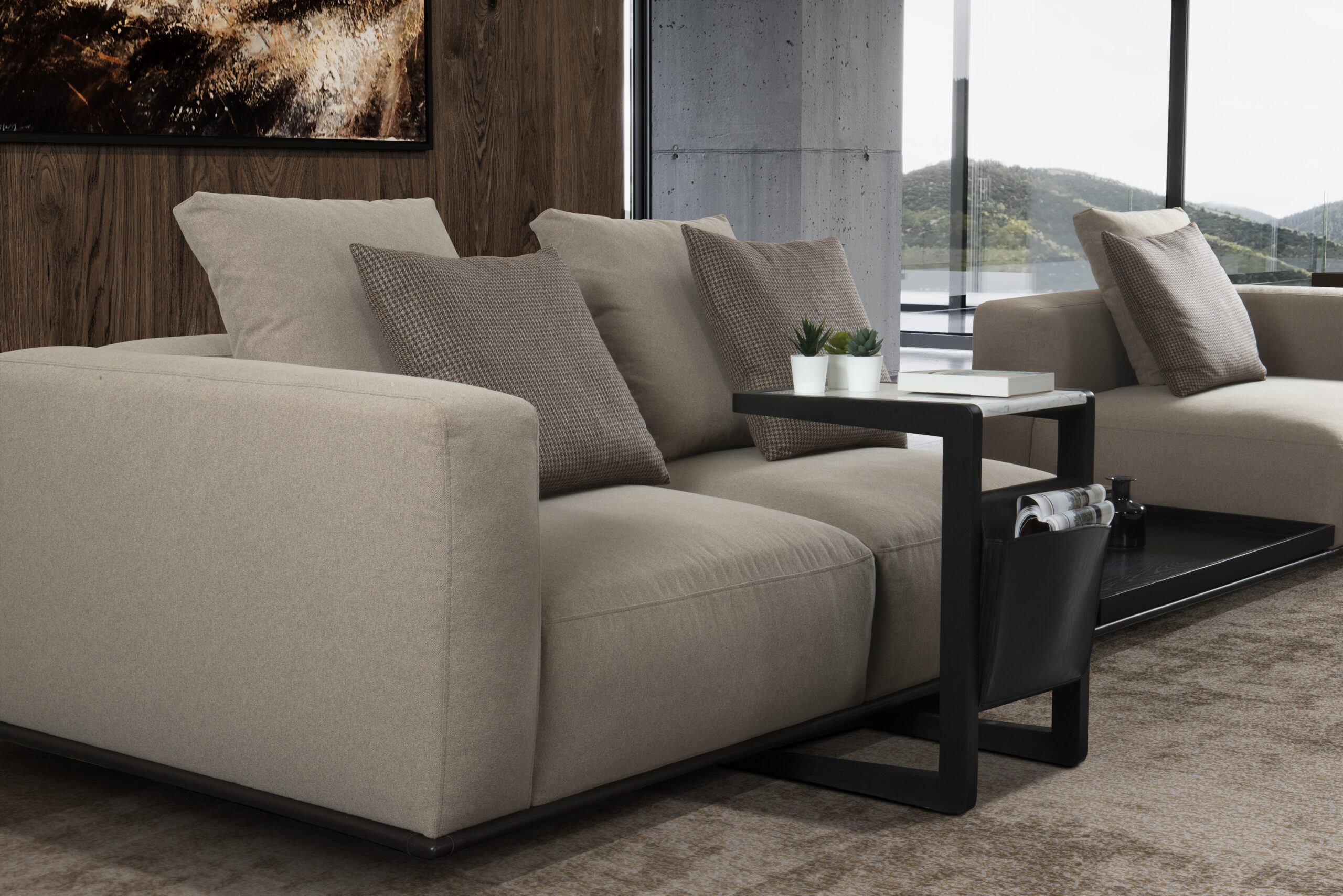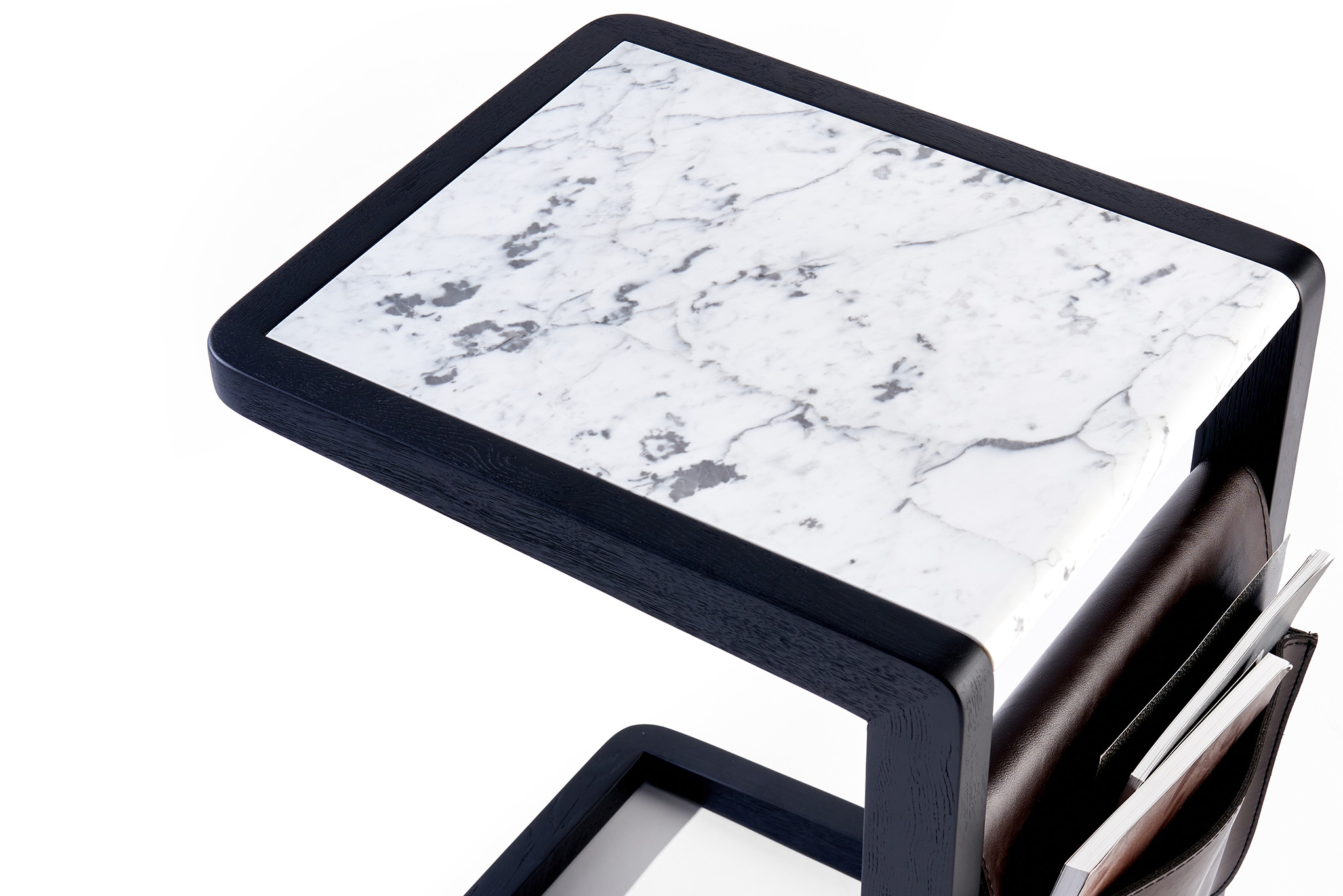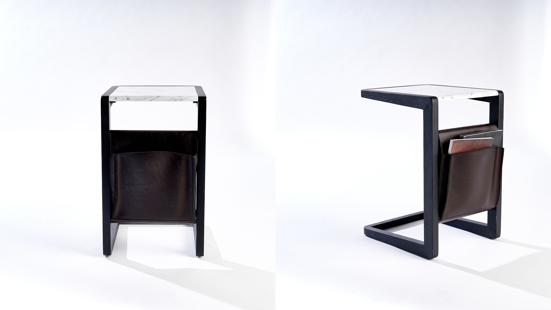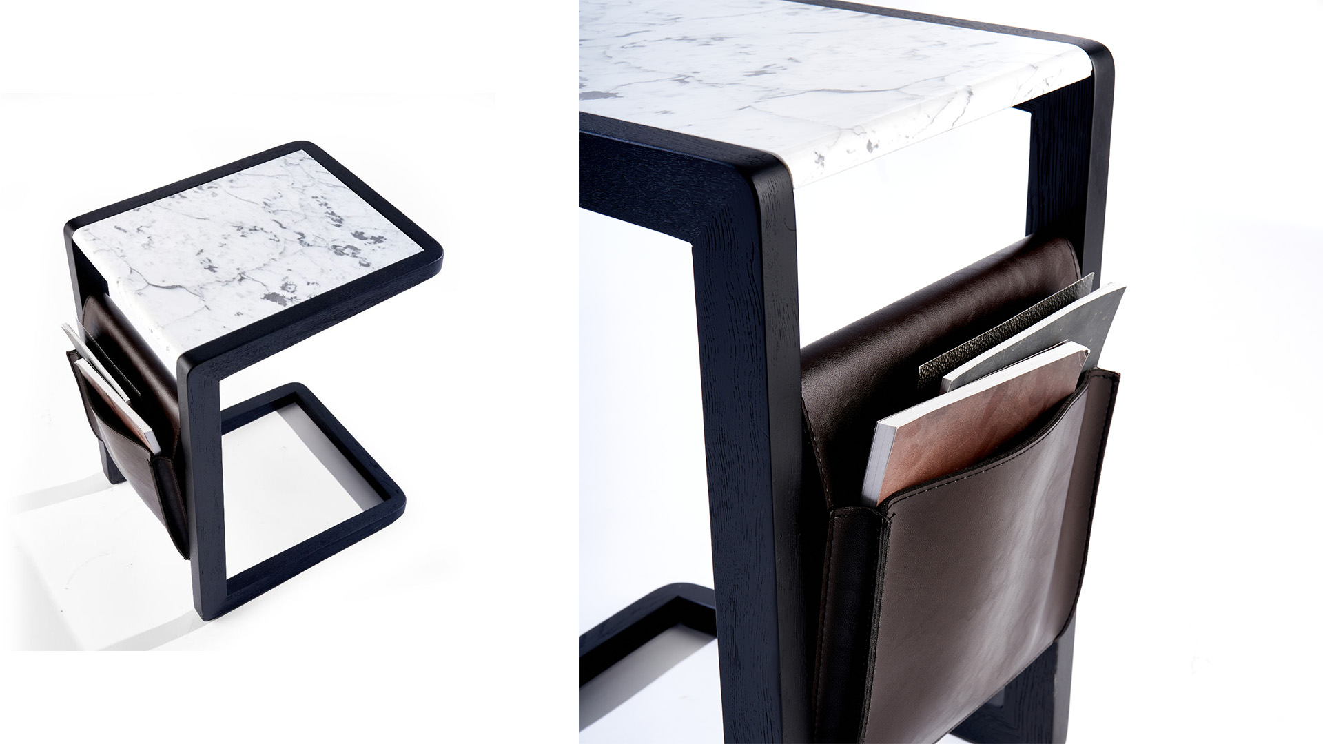 Series of side-tables in different misures with frame in solid ash. Available with one top in marble or with a lower top in marble. It is a design wonder that integrates with leather details.