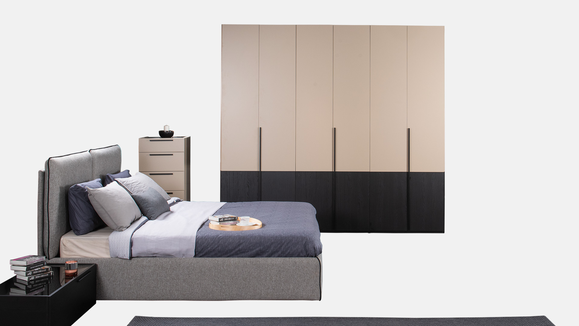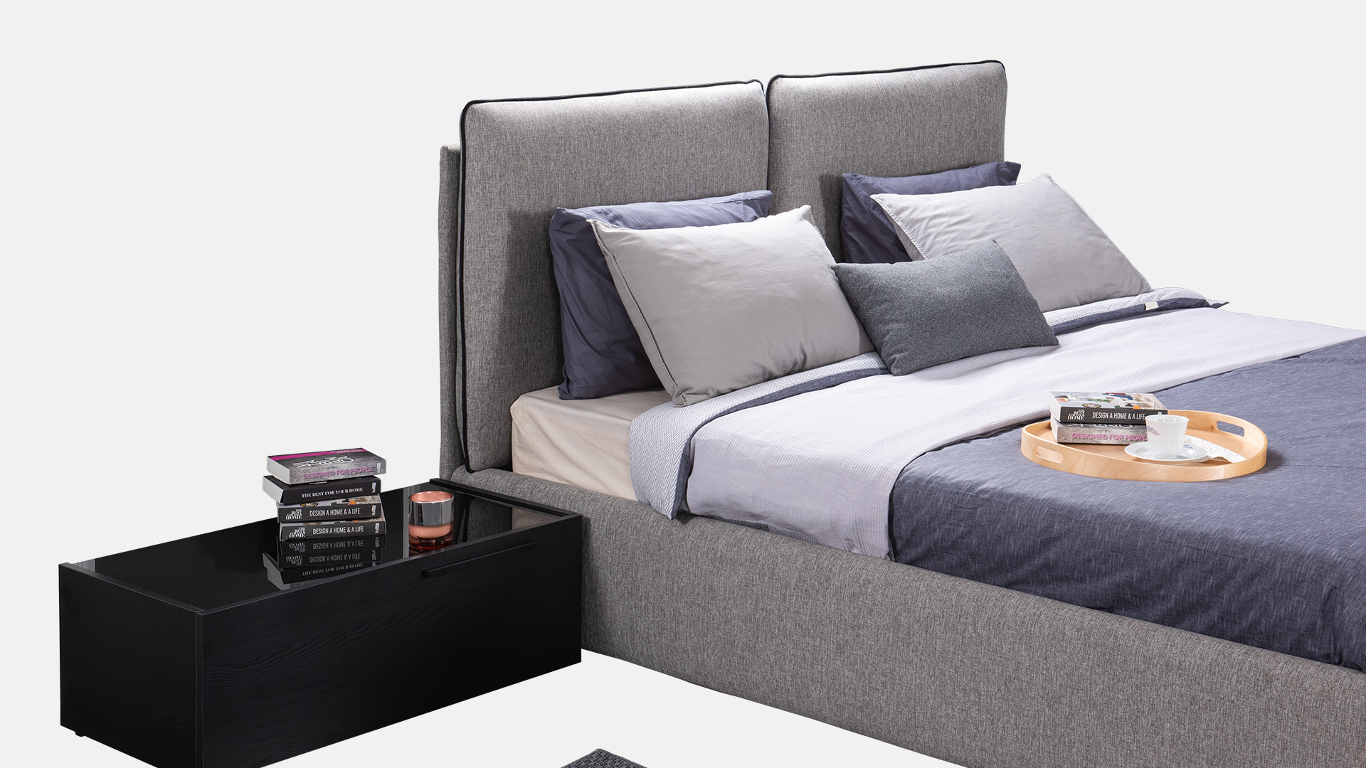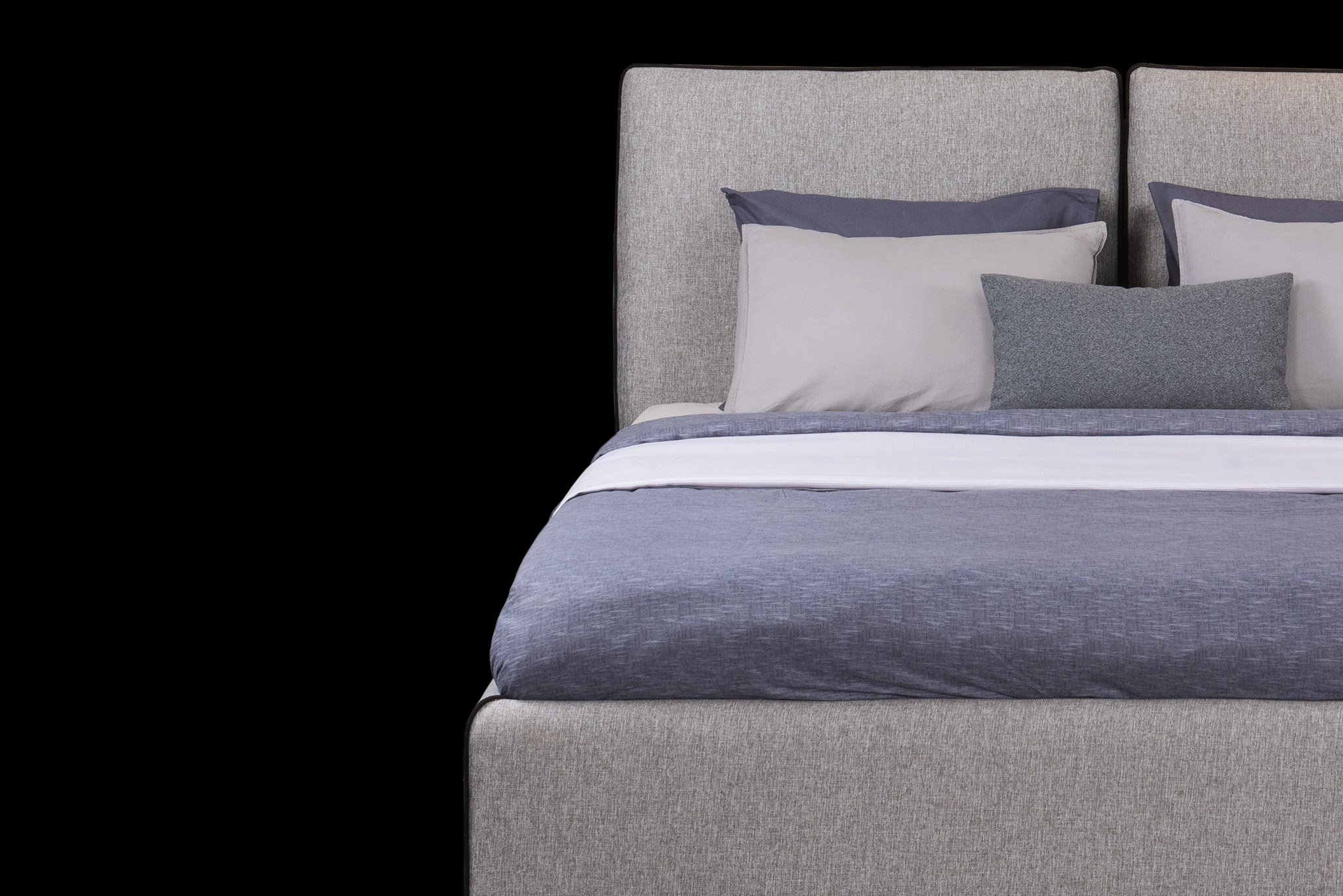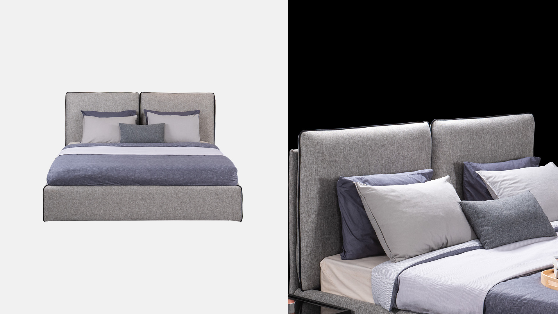 The elegance of simplicity. Navi has contrasting piping trim outlining the edges of the large cushions and on the corners on the bed frame, a detail that is never predictable and can completely change the appearance of our bed