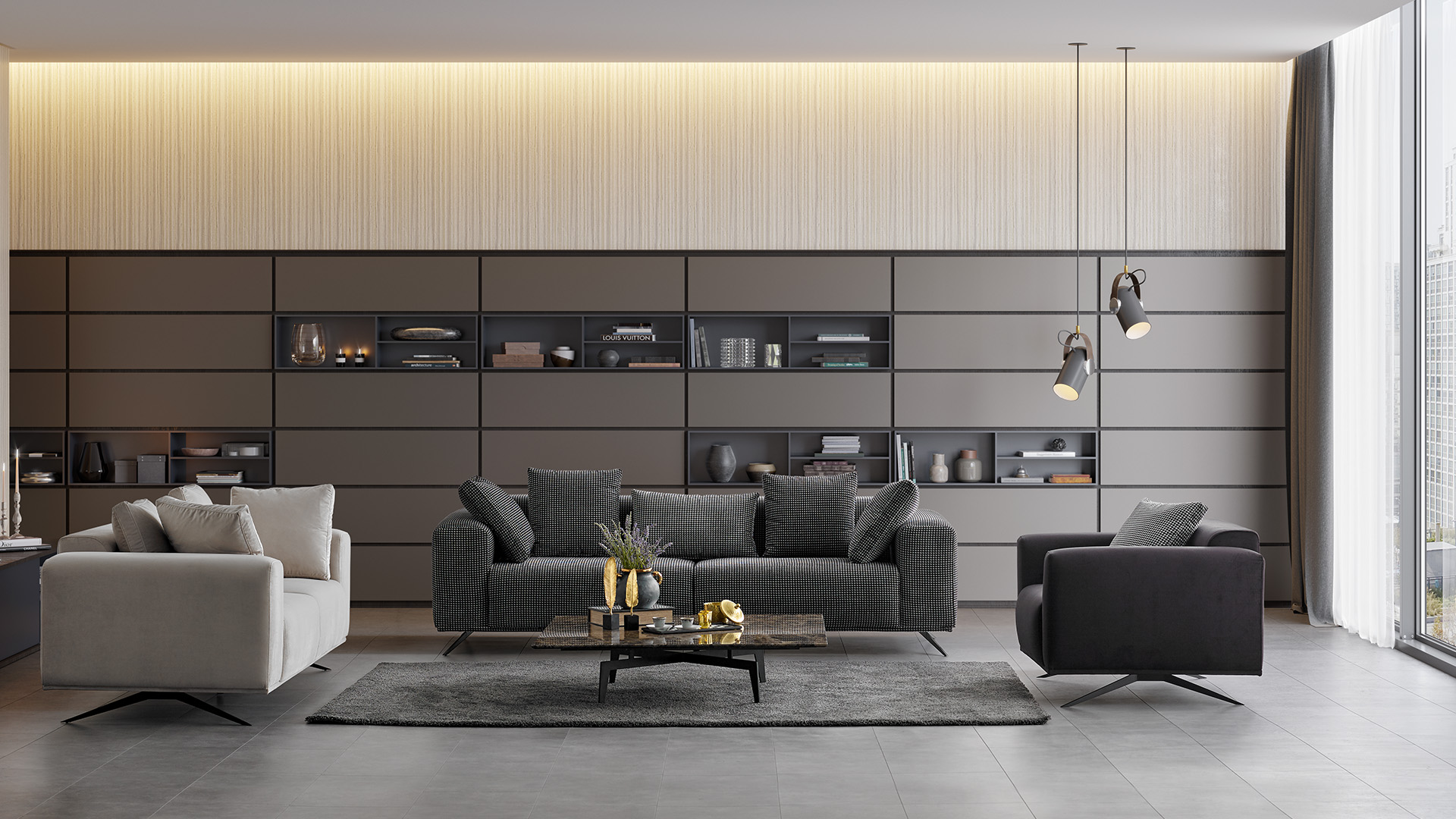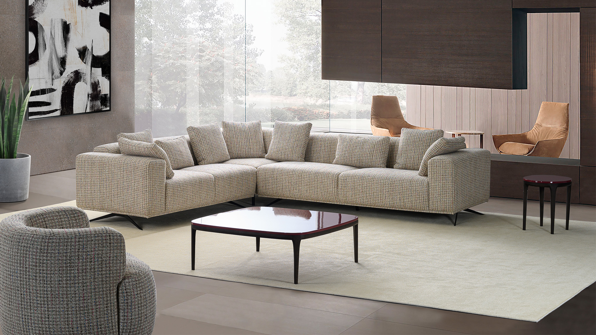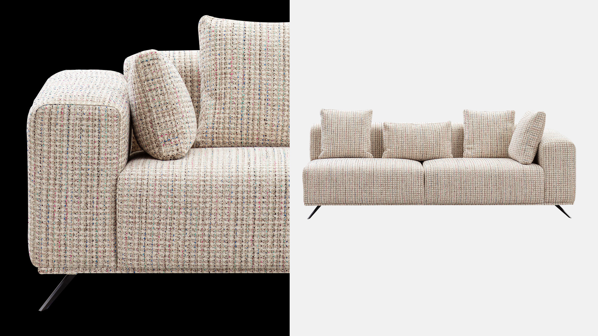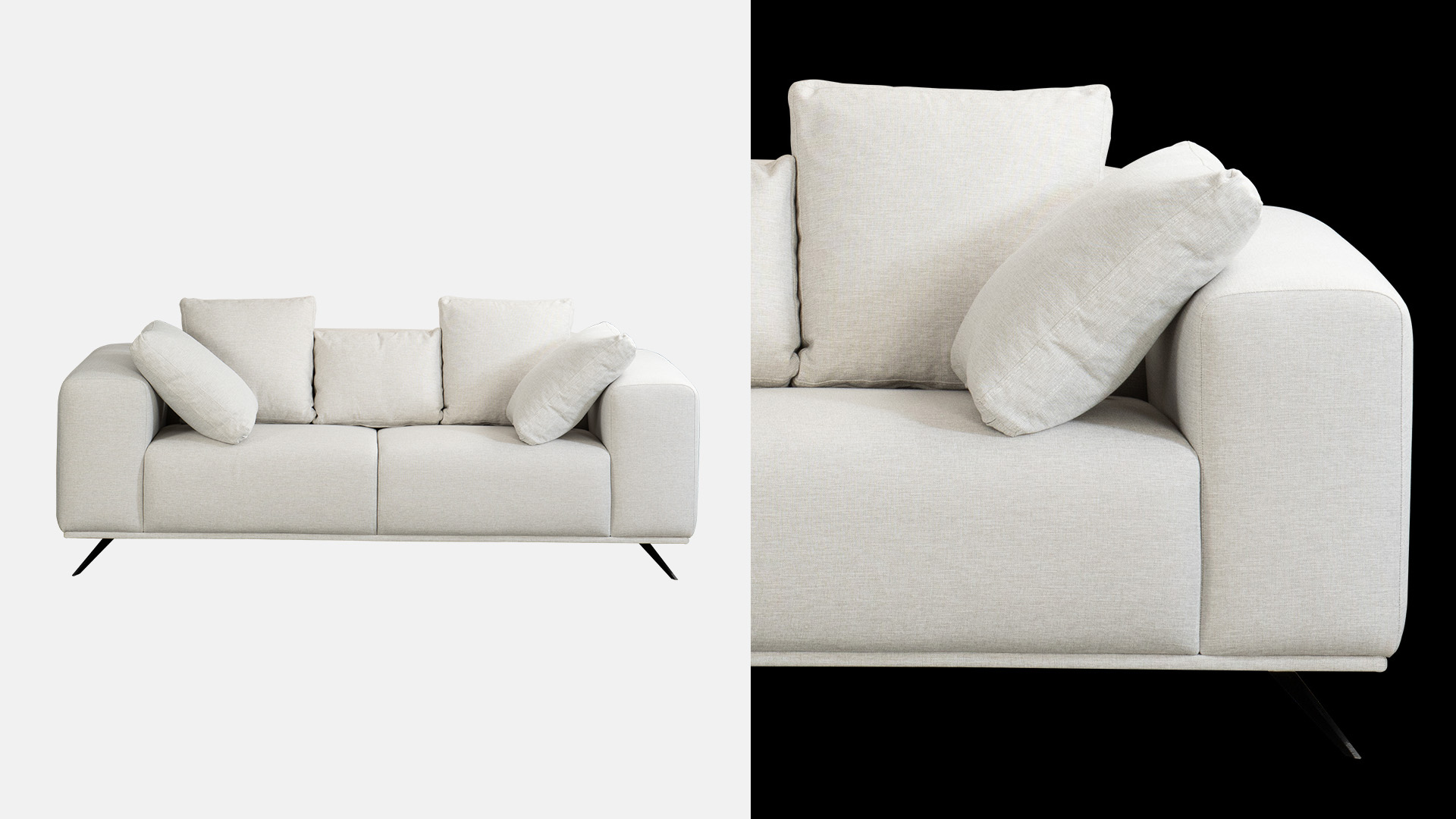 Sirius is a minimalist and soft design filled with different densities of high-density polyurethane foam. Goose down on the back cushions. Strong metal legs complete the design. You can find a perfect harmony in your home with fabric options of many color